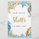 NO OLVIDES AÑADIR EL NOMBRE Y LA FECHA DE BRIDE EN LA ESPALDA. | Este juego "Under the Sea Blue" y "Gold Bridal Shower Game" (¿cuántas conchas en el frasco?) incluye caballitos de mar, peces estrella, conchas y arrecifes de coral. Para una personalización más avanzada de este diseño, haga clic en el botón "Personalizar" de arriba. También están disponibles los elementos coincidentes.