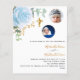Por el bautismo de dos niños, niños, mellizos. Un fondo blanco adornado con vegetación eucaliptos y hojas doradas y un rosa azul claro, flor. Personaliza y los nombres de los niños, fotos y detalles de la ceremonia. Letras de color negro y dorado. 1 hoja = 1 borde impreso de invitación al borde.