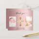 Personalice y agregue 3 de sus fotos, tamaño vertical, fecha, nombre y nota de agradecimiento. Un fondo de aspecto metálico rosa fino y negro. El texto: Gracias en la parte delantera y sus nombres en la parte trasera están escritos con un elegante guión con letras a mano con guiones.