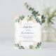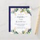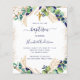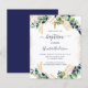 En la parte delantera, un fondo blanco decorado con vegetación eucaliptus y hojas doradas y chispas purpurinas de oro falsas. Una cruz dorada. Personalización y nombre del niño y detalles de la ceremonia. Texto azul. Fondo azul marino.