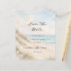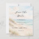 A watercolored sandy beach, sand dunes, ocean waves background. Personalize and add a date and your names. The text: Save the Date is written with a large trendy hand lettered style script.