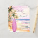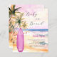 Una elegante invitación para un Baby Shower, para celebrar a una niña. Un atardecer rosa y acuático, una playa de arena, olas oceánicas y palmeras como telón de fondo, y una tabla de surf rosa y blanca en la playa. 1 hoja = 1 borde impreso de invitación al borde.