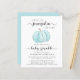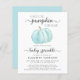 Un lindo, alegre y económico bebé roció por invitación por correo con "A Sweet Little Pumpkin Is On His Way" escrito en una mezcla de tipografía gris y moderna y escritura elegante con toallitas, y una acuarela azul pastel de una calabaza. Personalice el nombre de la madre y roce detalles en una simple tipografía gris.