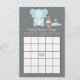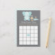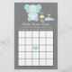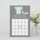Un pequeño pájaro marrón sostiene un paraguas polka dot amarillo y se para dulcemente y pacientemente al lado de un elefante bebé azul claro con un par de pañales con un pañal azul sobre él. Esta hoja de bingo de ducha de bebé para elefantes es perfecta y una manera divertida de celebrar a la nueva madre esperando a un bebé. Pintura © Chrissy H. Studios, LLC. Todos Los Derechos Reservados.