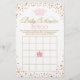 Tarjeta de bingo de baby shower de princesa tiara real con efecto de brillo dorado y puntos rosados con castillo en el centro.