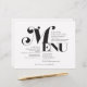 Este estilo vintage de 11" x 8.5" menú de papel boda para la cena con letras negras con un estilizado "Menú", en grandes letras negras sobre un fondo blanco alabastro. La carta incluye 2 entrantes, 2 entrantes, 2 postres y las iniciales de la pareja de bodas.