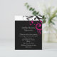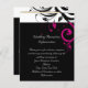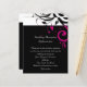 Impresionante e impactante invitación contemporánea contemporánea de bodas negras con acentos blancos y magenta, con delicado fondo de hojas de desplazamiento giratorio. Personalizar en línea con los datos de su boda.