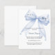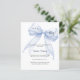 An elegant white background, decorated with a large blue bow with pearls. Personalize and add a name and party details.