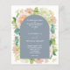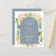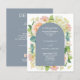 Las invitaciones a una boda azul polvorienta todo en uno muestran sus detalles en la parte delantera y trasera con letras blancas de moda. Hermosas flores acuáticas - hortensias blancas y verdes, rosas rosas y cremas, margaritas, tallos pequeños y hojas - en la parte delantera con tu información sobre un overlay arqueado. Impreso en papel asequible de 110 libras. **LOS ENVELOPES BLANCOS son un costo adicional. El servicio de diseño en vivo puede ayudarle con su diseño de diseño o colores si es necesario. COINCIDIENDO con los artículos de nuestra tienda.