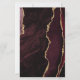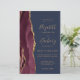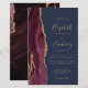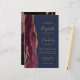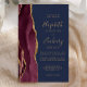 El borde izquierdo de esta elegante y moderna invitación a la boda incluye una acuarela color rojo burdeos recortada con un falso purpurina de oro. El texto del personalizable combina la escritura a mano de color dorado, las fuentes de copperplate y las tipografías cursivas en un fondo azul marino. El diseño de agate burdeos se repite en la parte posterior de la tarjeta.