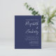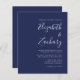 Esta sencilla y moderna invitación a la boda incluye texto blanco sobre un fondo azul marino. Añada los nombres de la novia y del novio en una caligrafía elegante de escritura a mano y los detalles en letra sans serif. El reverso es un tono de azul marino sólido.