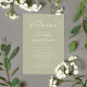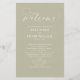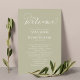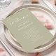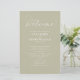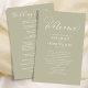 Una sencilla planilla de papel para el programa de ceremonias Bodas. con un elegante, minimalista, sencillo guión de caligrafía con tipografía de bienvenida, en un verde sabio botánico, y un estilo clásico.