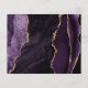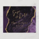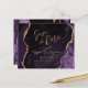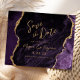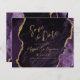 Esta elegante boda ahorra la tarjeta de fecha presenta una imagen de fondo de agate color morado adornado con falso purpurina de oro. El texto del personalizable combina la escritura a mano moderna de color dorado, el copperplate y las tipografías cursivas. El reverso presenta un diseño coordinado de agate morado y dorado.