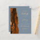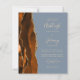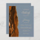 Ahorre el coste de imprimir y enviar por correo tarjetas RSVP independientes con esta elegante y moderna invitación a boda todo en uno. El borde izquierdo tiene un naranja quemado y un borde de acuarela rojizo recortado con purpurina de imitación dorado. El texto del personalizable combina la escritura a mano de color dorado pálido, el copperplate y las fuentes cursivas sobre un fondo azul polvoriento. El reverso proporciona espacio para los detalles de los bodas sobre un fondo azul polvoriento sólido, junto con un código QR que los huéspedes pueden explorar para visitar su sitio web y RSVP.