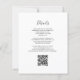 El borde izquierdo de esta elegante y moderna invitación a la boda incluye una barra acuática azul marino bordeada por un falso purpurina plateado. El texto del personalizable combina escritura a mano, copperplate y cursiva en gris carbón sobre fondo blanco. Añada detalles adicionales en la parte posterior, junto con un código QR para ayudar a sus huéspedes a visitar su sitio web boda.