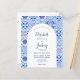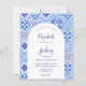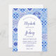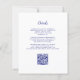 Este diseño rústico presenta un patrón de fondo de azulejos portugueses de color azul y blanco, o azulejos. Personalízalo con los nombres de la novia y el novio en escritura caligráfica azul y el texto restante en una combinación de sans serif, copperplate y cursiva en forma de arco blanco. El reverso proporciona espacio para los detalles del boda sobre un fondo blanco sólido, junto con un código QR que los huéspedes pueden explorar para visitar su sitio web y RSVP, lo que ahorra el coste de imprimir y enviar por correo tarjetas RSVP separadas.