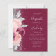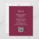 En el extremo izquierdo de esta elegante y moderna invitación a la boda se encuentra un ramo de flores en tonos burdeos y rosa rubí, adornado con Relieve metalizado falso plateado y follaje falso purpurina y salpicado de falsos purpurinas de plata. El texto del personalizable combina el guión de escritura a mano gris plateado, el copperplate y las fuentes cursivas en un fondo de color burdeos. El reverso proporciona espacio para los detalles de los bodas sobre un fondo burdeos sólido, junto con un código QR que los huéspedes pueden escanear para visitar su sitio web y RSVP.