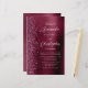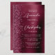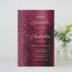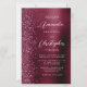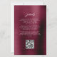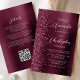 El borde izquierdo de esta elegante y moderna invitación a la boda incluye una frontera burdeos purpurina. El texto del personalizable combina la escritura a mano blanca y las fuentes sans serif en un fondo metalizado burdeos y falsos. El reverso proporciona espacio para los detalles del boda en un fondo metalizado de color burdeos, junto con un código QR que los huéspedes pueden escanear para visitar su sitio web y RSVP, lo que ahorra el coste de imprimir y enviar tarjetas RSVP separadas.