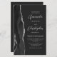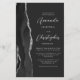 El borde izquierdo de esta elegante y moderna invitación a la boda incluye un borde de ágata color de agua negro recortado con un falso purpurina de plata. El texto de personalizable combina guiones de color gris plateado y fuentes sans serif en un fondo fuera de negro. El lado inverso proporciona espacio para los detalles del boda en un fondo sólido de color negro, junto con un código QR que los huéspedes pueden explorar para visitar su sitio web y RSVP, lo que ahorra el coste de imprimir y enviar tarjetas RSVP separadas.