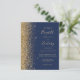El borde izquierdo de esta elegante y moderna invitación a la boda incluye un purpurina de imitación dorada. El texto del personalizable combina la escritura a mano de color dorado, las fuentes de copperplate y las tipografías cursivas en un fondo azul marino. El reverso proporciona espacio para los detalles del boda sobre un fondo azul marino sólido, junto con un código QR que los huéspedes pueden explorar para visitar su sitio web y RSVP, lo que ahorra el coste de imprimir y enviar tarjetas RSVP separadas.