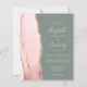 El borde izquierdo de esta elegante y moderna invitación a la boda incluye una mezcla de acuarela rosa y lustre bordeada por un falso purpurina de oro. El texto del personalizable combina la escritura a mano de color claro, el copperplate y las fuentes cursivas en un fondo verde de sabio profundo. El reverso proporciona espacio para los detalles del boda sobre un fondo verde de sabio sólido, junto con un código QR que los huéspedes pueden explorar para visitar su sitio web y RSVP, lo que ahorra el coste de imprimir y enviar por correo RSVP independiente