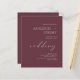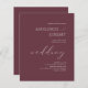 Esta sencilla y elegante invitación a la boda incluye la palabra "boda" en un elegante guión en blanco. Personalízalo con los nombres de la novia y el novio en letras mayúsculas en serif blancas (unidas por la palabra "y" en escritura que coincide con "boda") y el texto restante en cursiva blanca en minúsculas en un fondo borgoñoso.