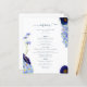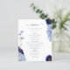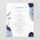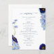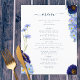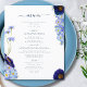 Hermosas flores silvestres de color boho y follaje en tonos azul celeste, azul flor de maíz, marina, violeta y verde, ideal para un único día de primavera o verano del menú boda. El elegante guión moderno de la tipografía en azul marino complementa el magnífico trabajo de arte pintado a mano de boho que incluye flores de maíz, amapola, cosmos, olvídenme nots y delicado follaje. Menú boda bohemio de moda perfecto para una pradera primaveral, boda en el jardín de verano. Pintura original de la artista Catherine Sweetman