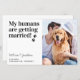 Que tu Mejor Perro anuncie a tu boda con este moderno y elegante perro mascota "Mis Humanos se están casando", salva las postales de citas. Estas tarjetas de invitación para bodas de presupuesto tienen una opción de sobres. Personalizar con tu foto favorita de compromiso, foto del perro o foto con el perro, y personaliza con nombres, fecha y ubicación del boda. ¡Estas invitaciones de bodas de perros son imprescindibles para los amantes del perro y las madres de perro! DERECHOS RESERVADOS © 2020 Judy Burrows, Black Dog Art - Todos los derechos reservados. Boda de fotografía mascota Perro Guardar presupuesto de tarjetas de fecha
