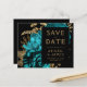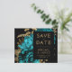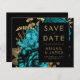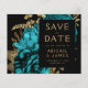 Esta elegante boda monacal Save the Date cuenta con un exuberante y romántico ramo floral de color turquesa con un Relieve metalizado de imitación dorada y follaje purpurina sobre un fondo negro. Personalizar el texto de color dorado en fuentes elegantes en un rectángulo negro, y agrega la dirección URL de su sitio web boda a la espalda negra sólida.