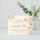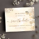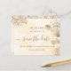 Un fondo dorado de color agua decorado con un follaje de eucalipto dorado y un polvo falso de purpurina dorado. Personalice y agregue la fecha, el lugar y los nombres. Letras de colores dorados. El texto: Save the Date se escribe con un gran guión de estilo escrito a mano.