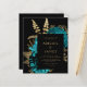Esta elegante y divertida invitación a la boda incluye un exuberante y romántico ramo floral de color turquesa con un Relieve metalizado de imitación dorada y follaje purpurina sobre un fondo negro. Personalizar el texto de color dorado en fuentes elegantes en un rectángulo oscuro. El reverso es negro sólido.