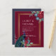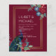 Hermoso pavo real con flores Verde azuladas y azules, borgoñas, hojas verdes saladas en este otoño, otoño, artículos de boda de invierno. Parte de una colección más grande que incluye invitaciones para bodas con presupuesto, guardar las fechas, confirmaciones de asistencia, tarjetas de fotos de agradecimiento, regalos para novias y fiestas de boda, y más. Para una planificación de bodas en invierno GRATUITA, visite weddingdesignchic.com.