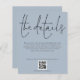 Una alternativa de valor por dinero BUDGET en un tamaño menor de 4,5 x 5,6" de peso semibrillante de 110 libras, que es de espesor similar al de una postal (sin embargo, no es adecuado para usar como postal). POR FAVOR, TENGA EN CUENTA QUE HAY UNA invitación por hoja. Boda Detalla el código QR Script Dusty Blue. Cuando envíe sus invitaciones, informe a su boda de detalles como instrucciones e información de alojamiento. Este elegante diseño ha establecido una tipografía elegante de gran tamaño para el título Los detalles y el resto del texto pueden ser fácilmente personalizados a sus palabras junto con su sitio web código QR. Puede elegir cualquier color de su elección para el texto y los colores de fondo en ambos lados mediante la opción personalizar adicional.