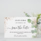 Una boda de moda Salven la Fecha. Un elegante fondo blanco decorado con follaje eucalipto y polvo falso purpurina dorado. Personalice y agregue una fecha, nombres y texto. ... El texto: Save the Date se escribe con un gran guión de estilo con letras a mano y a la moda con guiones.