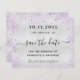 Una boda de moda Salven la Fecha. Un falso fondo plateado. Decorada con chispas purpurinas de color morado y lavanda. Personalice y agregue una fecha, un lugar y sus nombres. Save the Date se escribe con un guión de estilo con letras a mano moderno y con cambios.