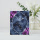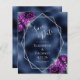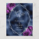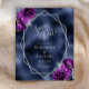 Esta elegante boda moderna, salvo la tarjeta de fecha, tiene un marco geométrico de plata decorado con ramos de flores de ciruela morada y plata sobre un fondo de Relieve metalizado falso azul marino. El texto del personalizable combina la escritura manual caprichosa de color gris plateado, el copperplate y las fuentes cursivas. El lado inverso repite la imagen del Relieve metalizado azul marino.