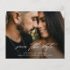 Una foto boda horizontal, romántica y simple ahorra la fecha con un hermoso overlay de caligrafía de escritura en el frente. La parte de atrás tiene un collage de 2 fotos con un sitio web boda. Haga clic en el botón de edición para personalizar de este diseño.