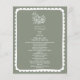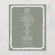 Ilustracion de líneas de arte de flores sobre fondo verde sabio. Texto blanco y borde de vieira dibujado a mano.