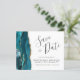 Este elegante presupuesto ahorra la tarjeta de fecha presenta un borde de agate color azul verde azulado recortado con falso purpurina de oro. El texto del personalizable combina el guión de escritura a mano gris carbón, el copperplate y las fuentes cursivas en un fondo blanco. El reverso presenta un diseño de agate verde azulado y dorado a juego.