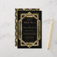 Esta elegante invitación de bodas de inspiración vintage presenta un texto de color dorado sobre un fondo negro, enmarcado por un diseño geométrico de Art Déco vintage. El dorado de la tarjeta está decorado con una decoración en la que predominan los motivos dorados y negros decorando la decoración.