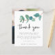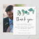 Boda de Eucaliptos Azul Verde azulado presupuesto Gracias. Un precio económico menor 4,5" x 5,6" alternativa. Disponible en un ALMACENAMIENTO DE TARJETAS SEMI-GLOSS de 110 lb que es la opción predeterminada (más grueso para las invitaciones), O UN ALMACENAMIENTO DE PAPELES DELGADOS SATIN FINISH DE 80 lb (ideal para los gabinetes). Los sobres son un extra opcional y son algo más grandes que el tamaño de la tarjeta. Estilo minimalista moderno con una sola rama de eucalipto azul verde azulado sale por la página desde el lado izquierdo. Gracias Se establece en un estilo informal de escritura a mano y se coloca debajo del follaje junto con su mensaje y nombres que puede personalizar fácilmente. Cámbiate fácilmente en tu foto favorita en la parte de atrás como un recuerdo para tus invitados. Puede cambiar el texto y los colores de fondo a cualquiera de sus opciones para que coincidan con el tema de color boda.