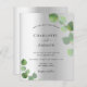 Una invitación a la boda moderna, elegante y minimalista. Fondo de aspecto metálico de color plateado falso decorado con vegetación eucaliptus, brotes. Personalice y agregue sus nombres y detalles del boda. Letras de color negro.