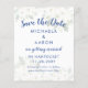 Presupuesto asequible Ahorra la fecha para un Boda Náutico o de crucero con un ancla de oro único con un corazón en la parte superior rodeado por un ramo de flores blancas con escritura caligráfica clásica y un texto sans-serif moderno que puede personalizar con la información de su boda costero o de club náutico en la parte delantera y trasera. El fondo azul marino se puede editar para que coincida con el esquema de color boda.