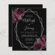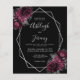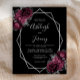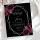 Esta elegante y moderna invitación a la boda presenta un marco geométrico de plata decorado con flores de color burdeos y plateadas sobre un fondo negro. El texto del personalizable combina la escritura manual caprichosa de color gris plateado, el copperplate y las fuentes cursivas. El reverso es negro sólido.
