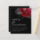 Boda negro plateado de flores rojas presupuestadas. Precio presupuestario PEQUEÑO alternativa de 4,5" x 5,6". Disponible en un ALMACENAMIENTO DE TARJETAS SEMI-GLOSS de 110 lb que es la opción predeterminada (más grueso para las invitaciones), O UN ALMACENAMIENTO DE PAPELES DELGADOS SATIN FINISH DE 80 lb (ideal para los gabinetes). Un ramo de flores rojas con follaje plateado está en la parte superior derecha y tus nombres son grandes en una elegante minúscula con los detalles en la parte inferior. Personaliza fácilmente el texto.