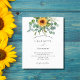 Un fondo blanco en la parte delantera, decorado con girasoles y vegetación eucaliptos. Personalice y agregue sus nombres y detalles del fiesta. Bacl: fondo azul polvoriento.