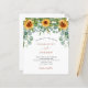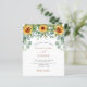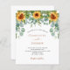 Un fondo blanco decorado con girasoles y vegetación eucaliptus. Personalice y agregue sus nombres y detalles del fiesta.