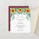 En la parte delantera, un fondo blanco decorado con girasoles y vegetación eucaliptica. Personalice y agregue sus nombres y detalles del fiesta. Volviendo: un fondo de color rojo y marrón