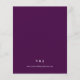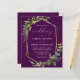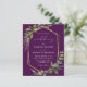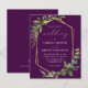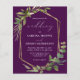 Esta elegante invitación a la boda rústica presenta un marco geométrico de Relieve metalizado de imitación dorada, decorado con eucalipto y vegetación de oliva sobre un fondo violeta de berenjenas profundas. La palabra "boda" aparece en escritura caligráfica. Personalizar el texto blanco con los nombres de la novia y el novio y los detalles del boda en la parte delantera, y sus iniciales y URL del sitio web al revés.