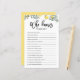 ¿Quién conoce mejor a mamá? Añade esta divertida y divertida tarjeta botánica de juego para la ducha de bebé a tu evento. Cuenta con ilustraciones acuáticos de limones y vegetación. Puede personalizar la tarjeta agregando textos de vuelta. Esta tarjeta de juegos para bebés con limón es perfecta para duchas de primavera y verano.